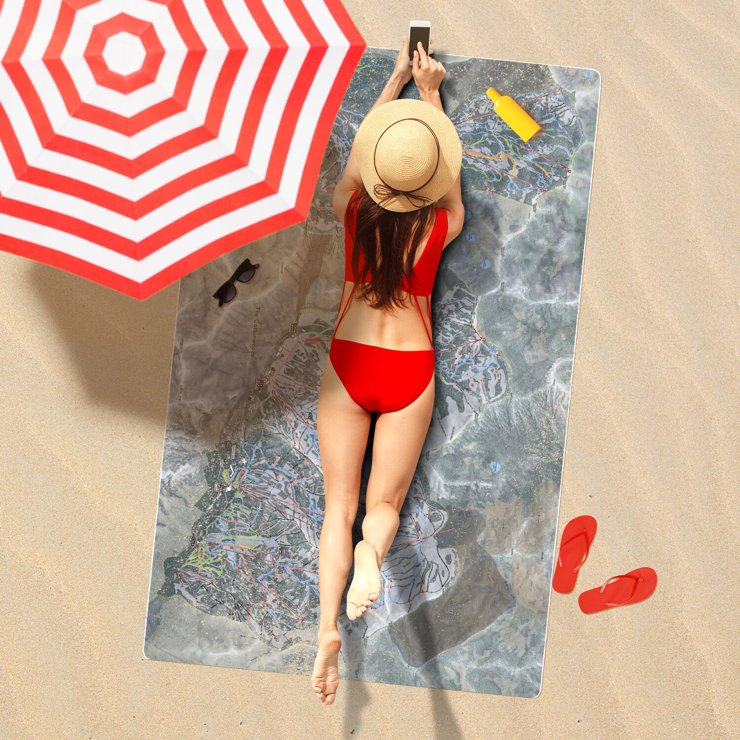 • The Cottonwoods, Utah Ski Resort Map Printed Beach Towel