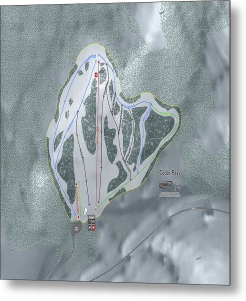 Cedar Pass Ski Resort Map metal print by Powder Addicts.   Bring your artwork to life with the stylish lines and added depth of a metal print. Your image gets printed directly onto a sheet of 1/16" thick aluminum. The aluminum sheet is offset from the wall by a 3/4" thick wooden frame which is attached to the back. The high gloss of the aluminum sheet complements the rich colors of any image to produce stunning results.