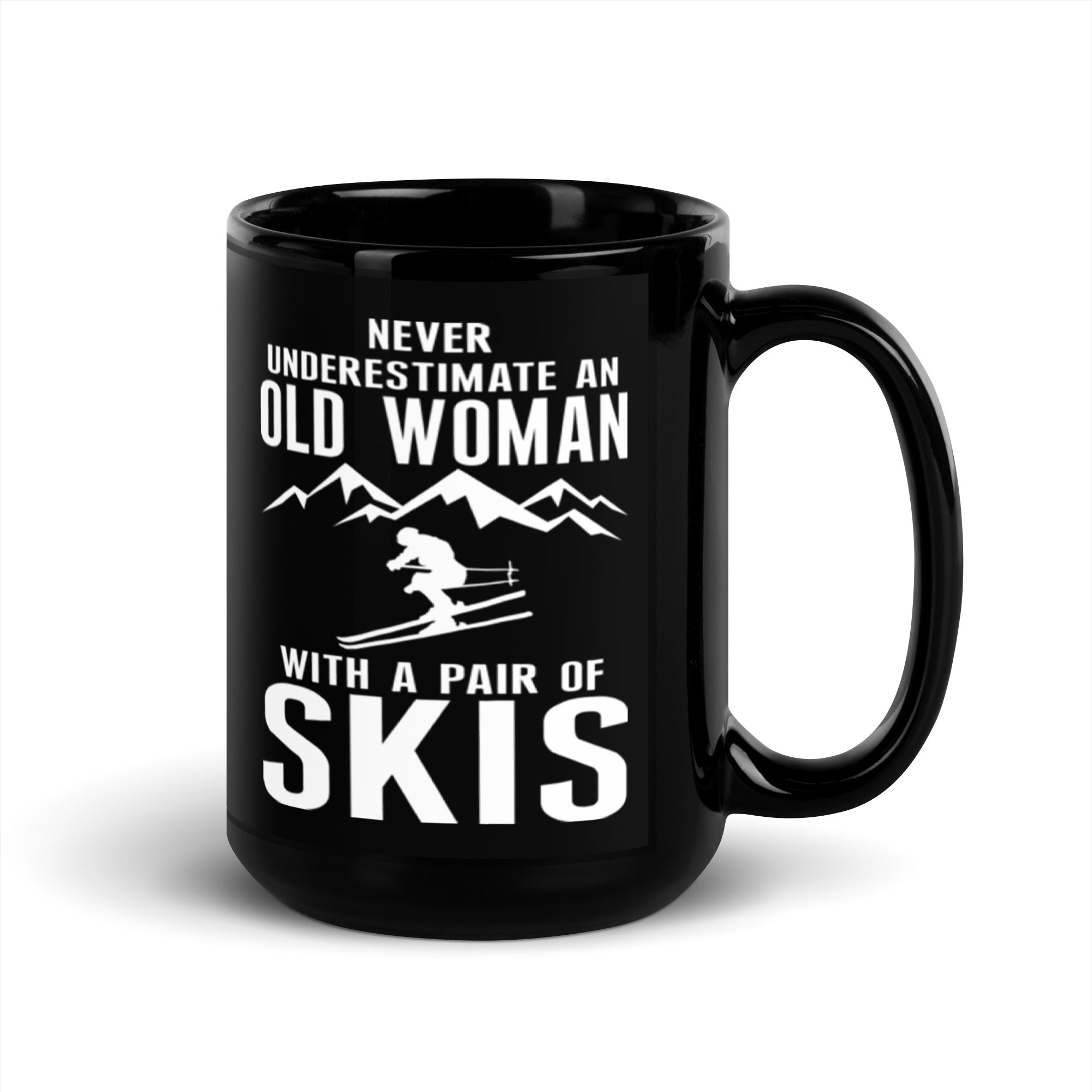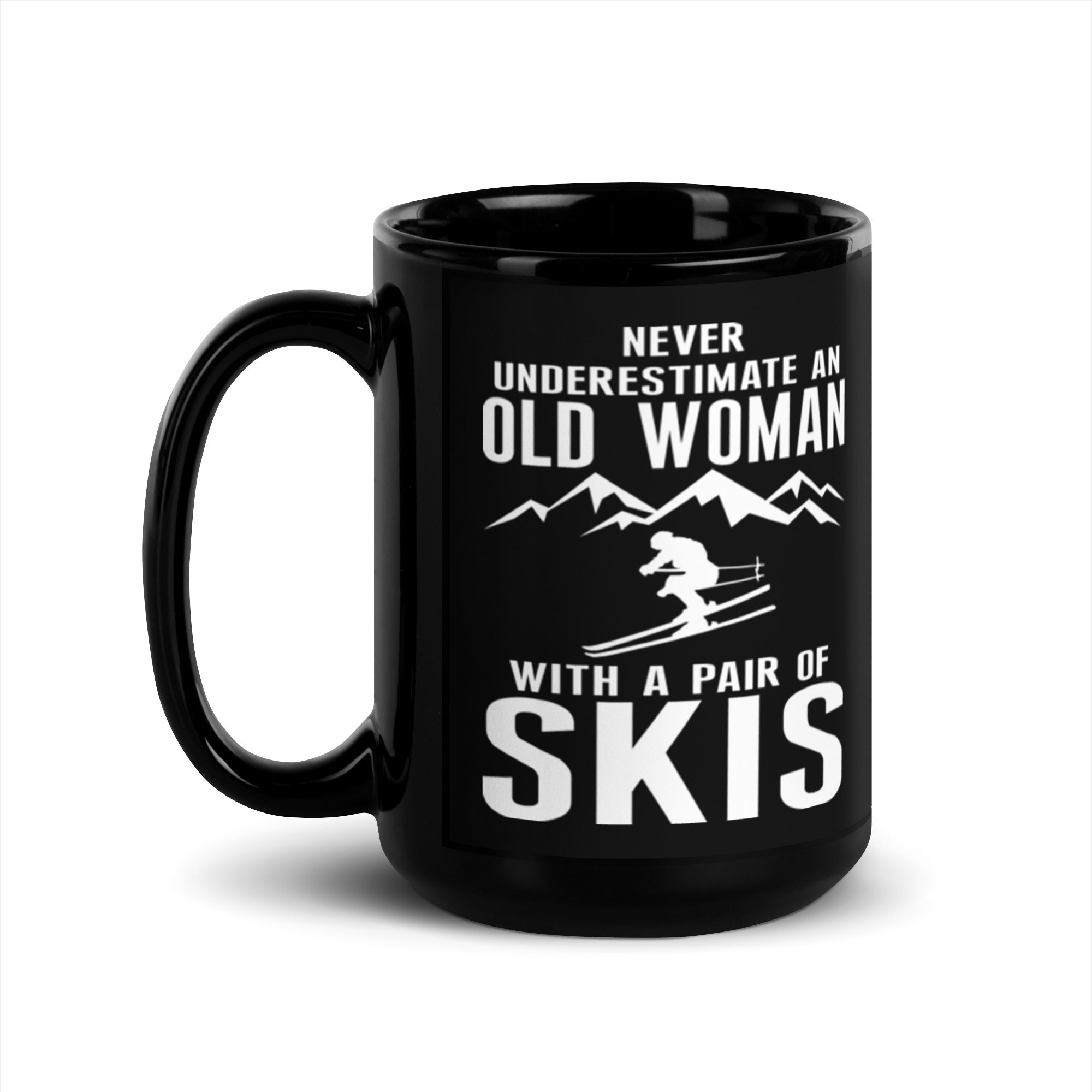 • Never Underestimate An Old Woman With A Pair of Skis Black Glossy Mug